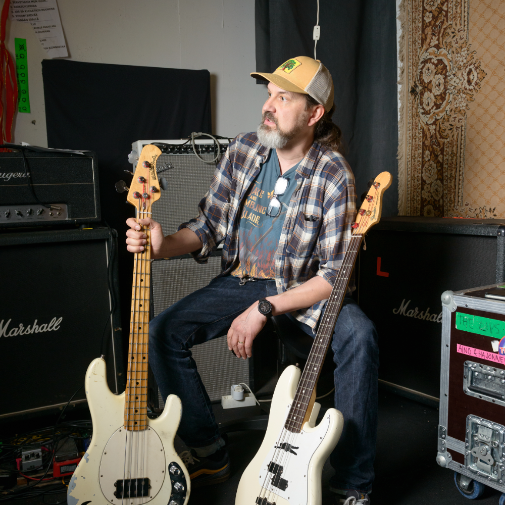 – Music Man oli minun ensimmäinen ”oikea bassoni”, hyvistä puista tehty soitin. Soundi on se mikä se on, eli siitä joko tykkää tai ei tykkää. Tämä ei siis ole ihan joka paikan höylä, vaan ylätaajuuksilta aika ”sirppi”. Mutta hiljaa sormilla soittaessa se kilinä tuo soundiin atakkia, ja toisaalta Stoner-tyyppinen särö niistää sitä yläpäätä sopivasti. Ostin tämän Manny’s Musicista New Yorkista, ja soitin tällä neljä ensimmäistä Donkkari-levyä.