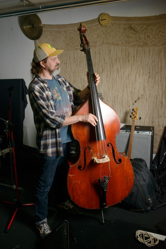 – Ostin itselleni sellaisen halvan Kiina-kontran, jonka eräs kaverini sitten kustomoi paremmaksi, avasi ihan atomeiksi. Siitä tulikin ihan käyttökeloinen soitin piezon kautta vahvistettuna. Mutta kun aloimme tekemään Rambling Bladen levyä, niin tarvitsin hyvin soivan instrumentin. Kysyin sitten Mikko Mäkelältä hänen kontrabassoaan lainaan. Kävi ilmi, ettei hänellä ollut Ismo Alangon bändissä sille tänä vuonna tarvetta, joten sain tämän koko vuodeksi käyttöön. Basistien joukossa on paljon YYA-meininkiä, eli soittimet kiertää soittajalta toiselle. Esimerkiksi oma Presarini oli pari vuotta kavereilla lainassa erilaisissa sessioissa, sillä en ole koskaan nauttinut omistamisesta, vaan siitä, että soittimet on käytössä.